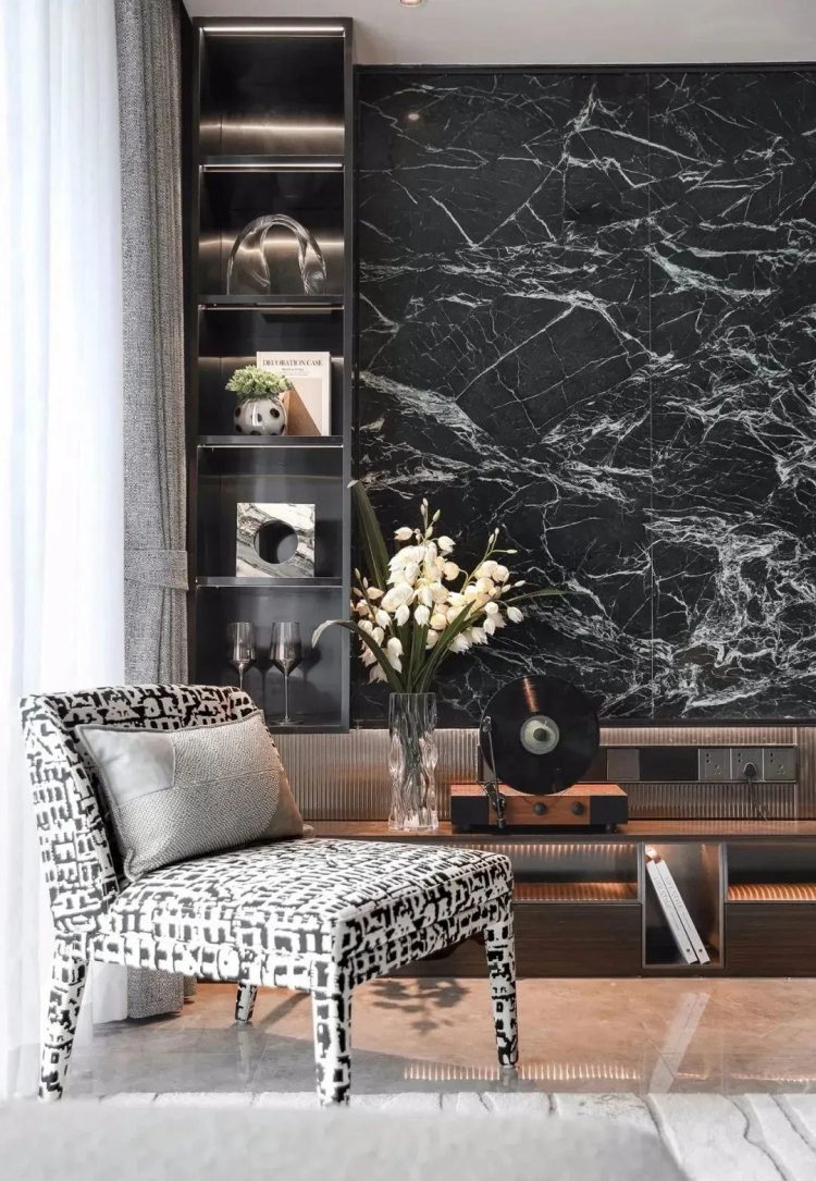 ห้องพักสร้างความน่าทึ่งและสง่างามทันทีโดยการใช้หินอ่อนสีดำ มันดูดีบนพื้นกรอบประตูหรือชิ้นส่วนสำเนียงที่มีพื้นหลังสีเข้มและเส้นเลือดที่สะดุดตา เพียงแค่ใช้มันเท่าที่จำเป็นเพราะสีดำมากเกินไปบางครั้งอาจให้ความรู้สึกเย็นหรือหนัก