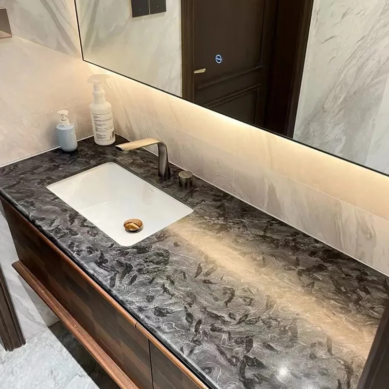 Versace Black Granite Slab เป็นหินสีดำแข็งมากใช้สำหรับห้องน้ำและเคาน์เตอร์ครัว เครื่องหนังที่พบมากที่สุดให้ความรู้สึกเป็นหินธรรมชาติกับพื้นที่ภายในใด ๆ